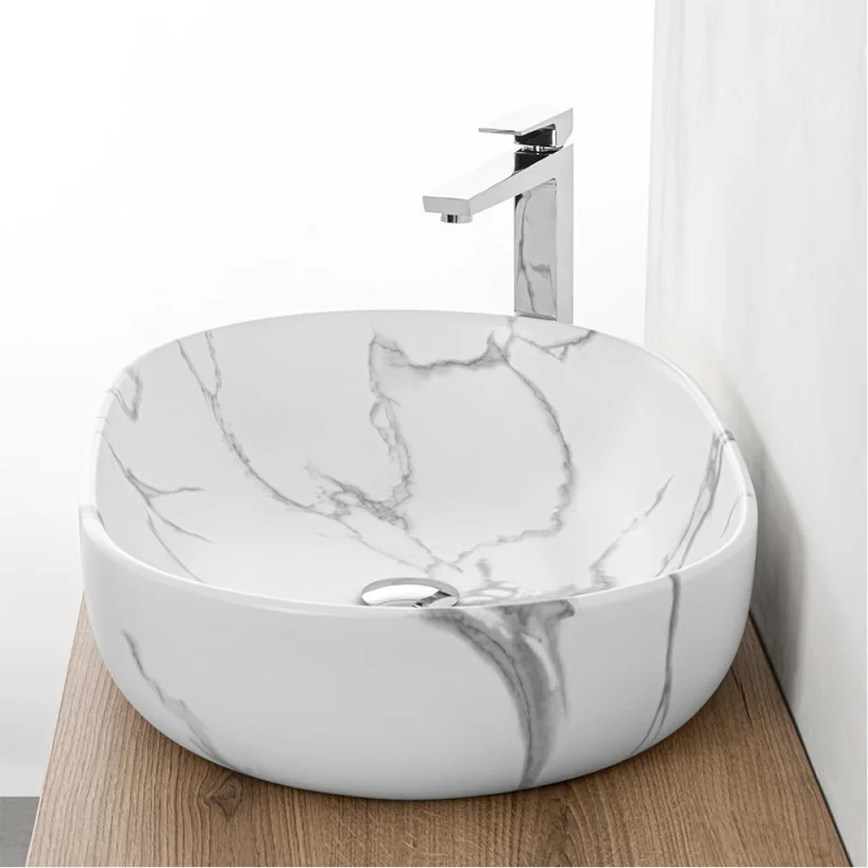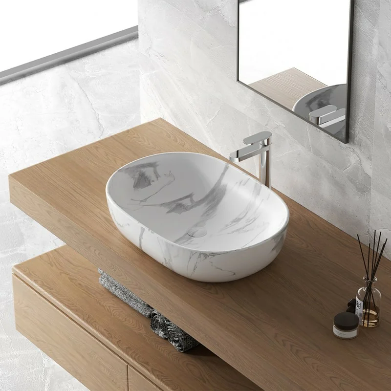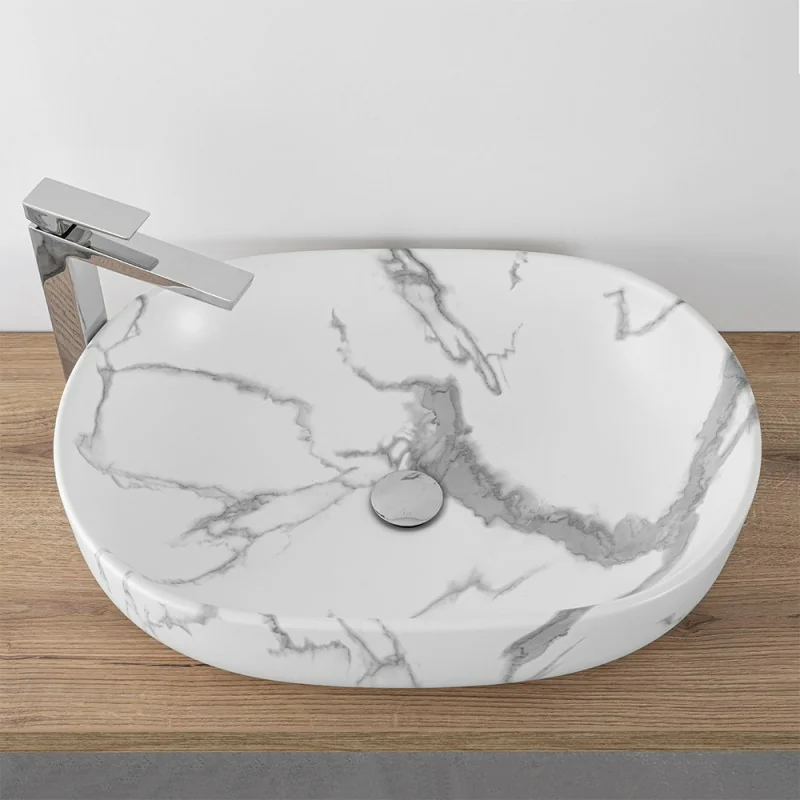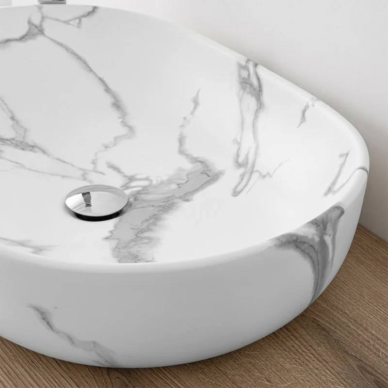 Lavandino da appoggio ovale da 60x41 cm in ceramica con effetto marmorizzato bianco Tokyo