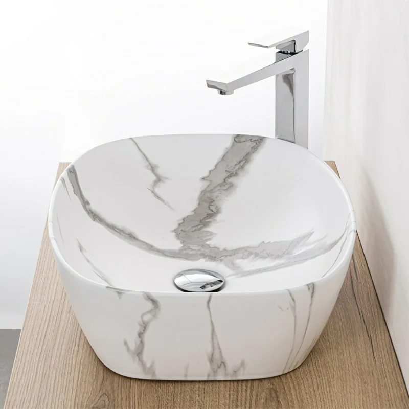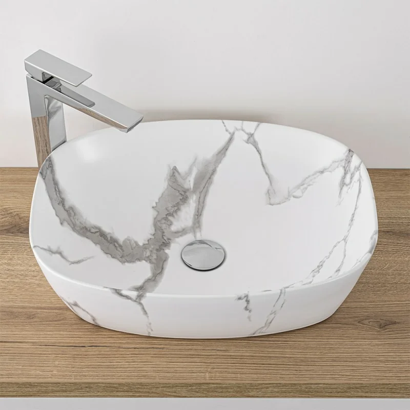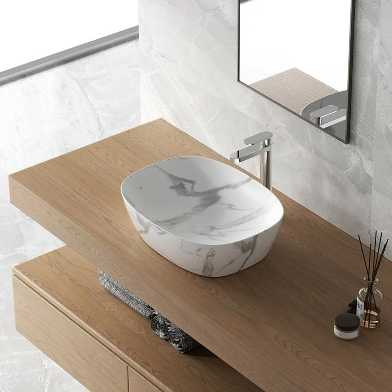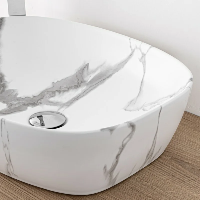 Lavandino da appoggio ovale 50x38 cm in ceramica con effetto marmorizzato bianco linea Tokyo