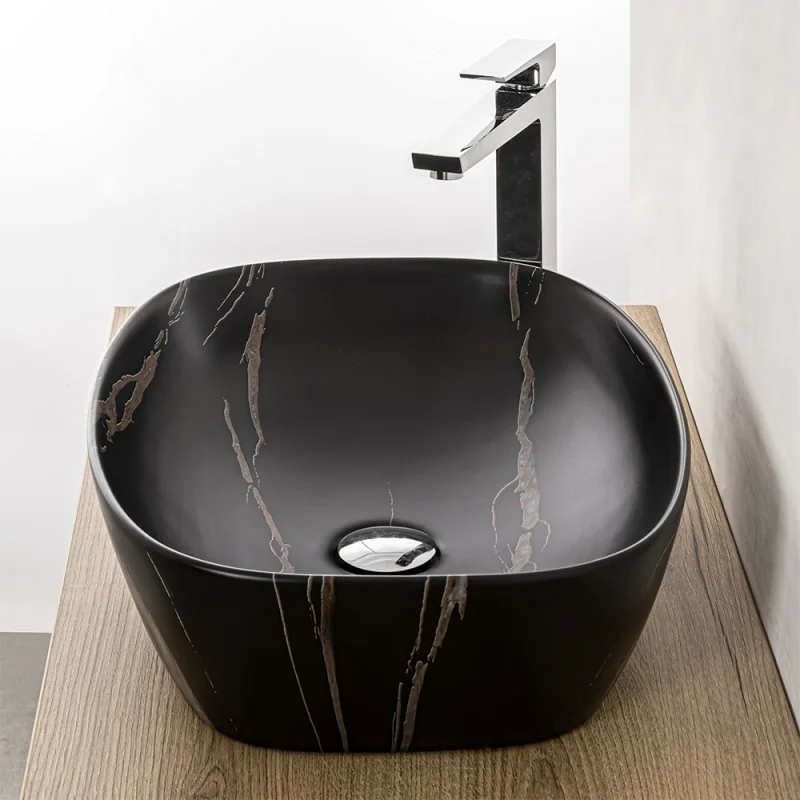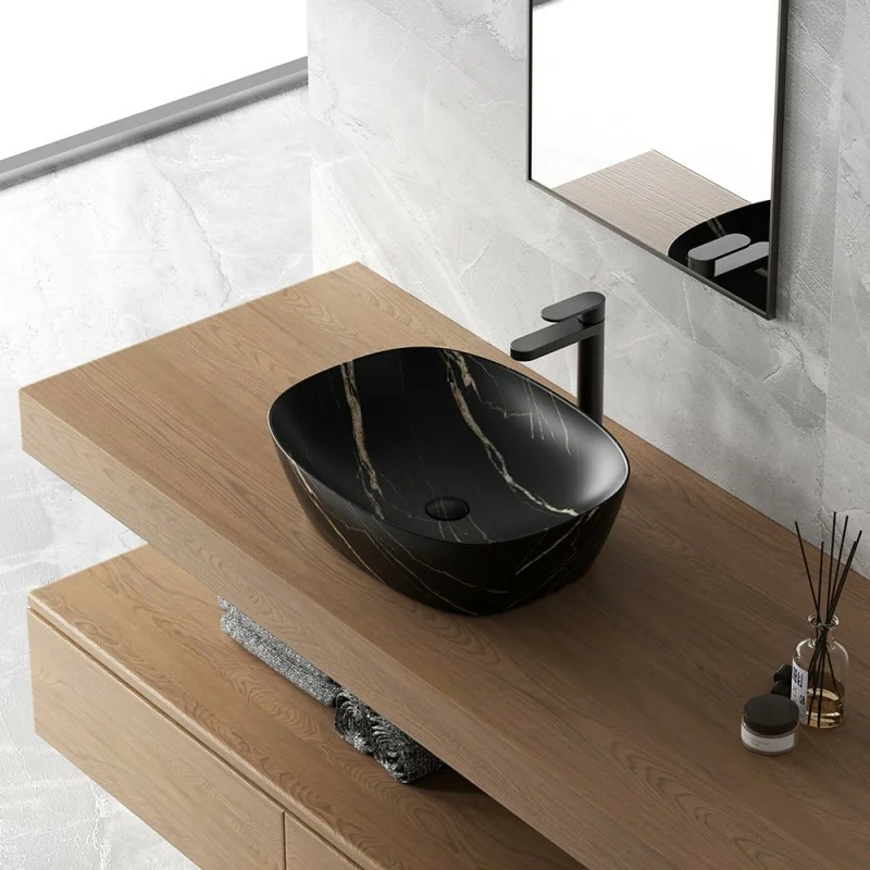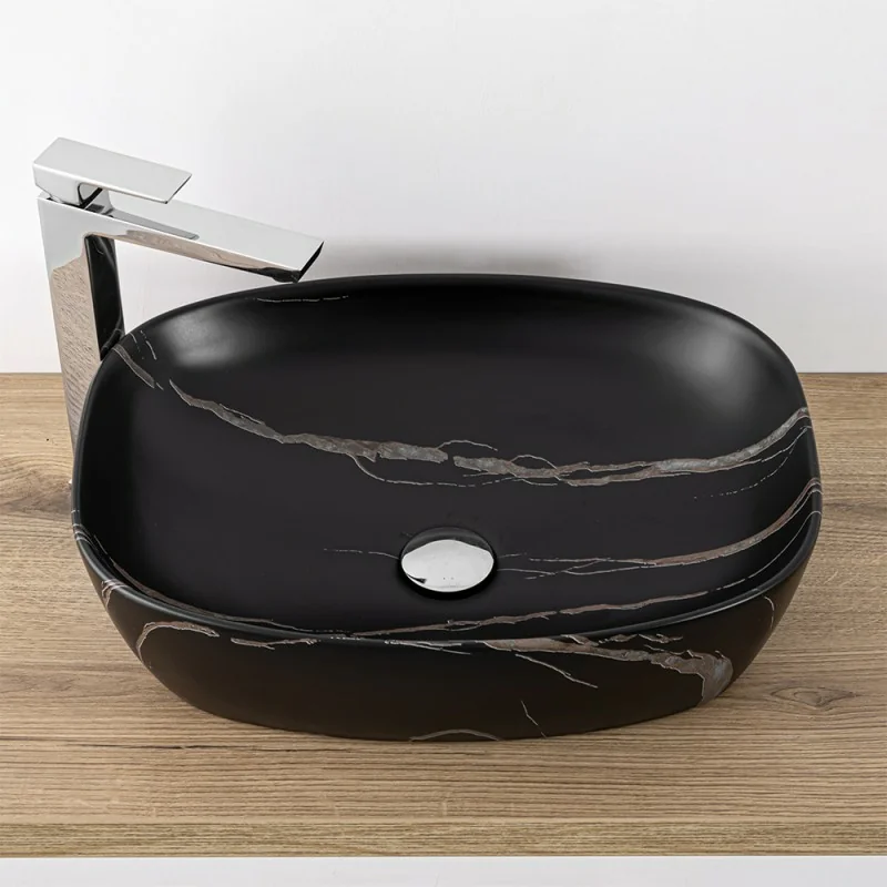 Lavabo da appoggio ovale da 50x38 cm in ceramica con effetto marmorizzato nero linea Tokyo