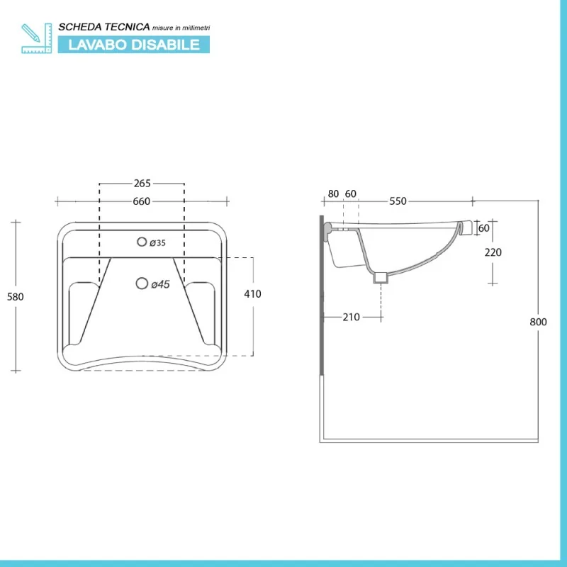 Lavabo sospeso per disabili 66 cm ergonomico con poggia gomiti