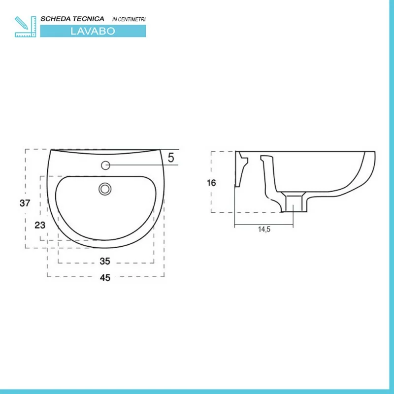 Lavabo sospeso 45x37 salvaspazio bianco in ceramica