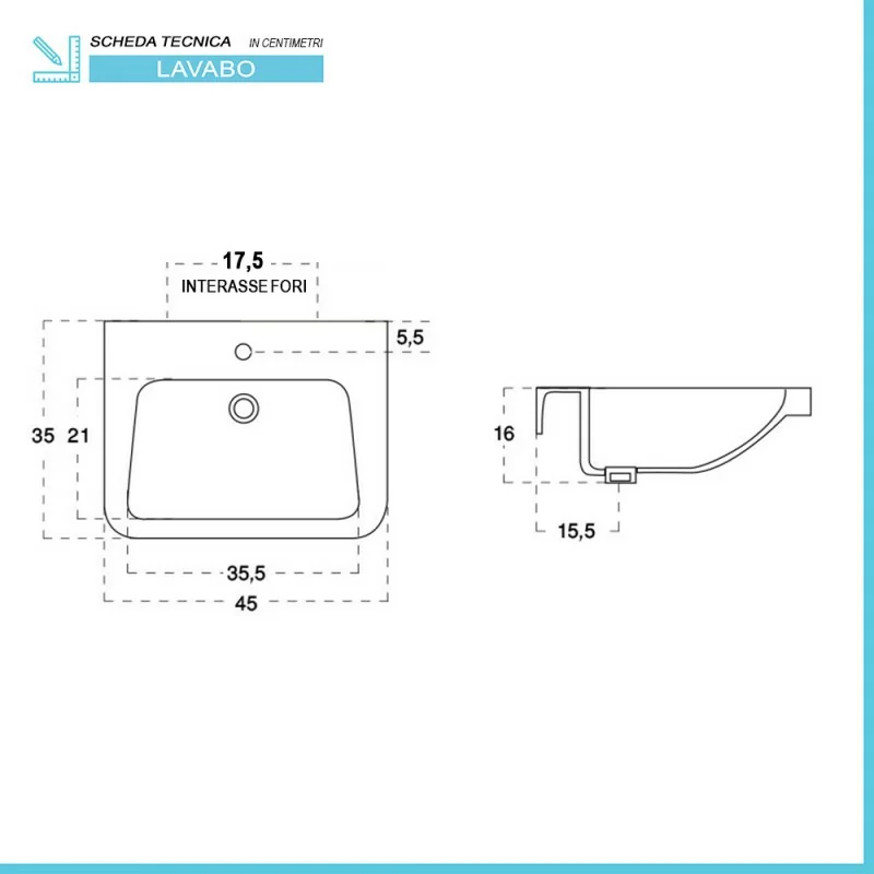 Lavabo sospeso 45x35 salvaspazio bianco in ceramica