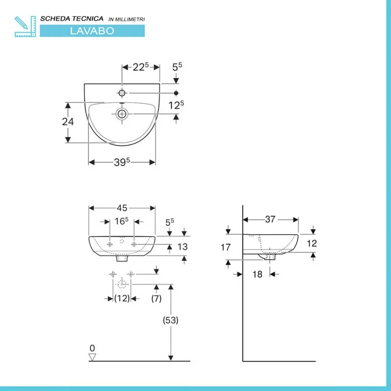 Lavabo sospeso – Geberit 45 cm finitura bianco lucido,foro per troppo pieno e miscelatore,linea Selnova