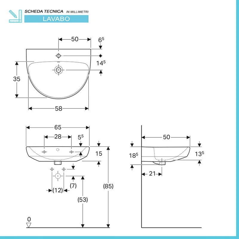 Lavabo sospeso – Geberit 65 cm finitura bianco lucido,foro per troppo pieno e miscelatore,linea Selnova