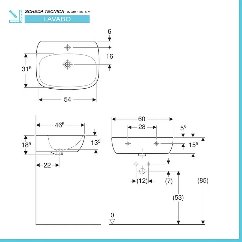 Lavabo sospeso – Geberit 60 cm in ceramica lucida,con foro miscelatore e troppo pieno,linea Fantasia