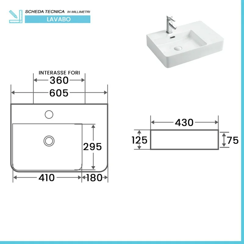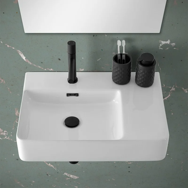 Lavabo rettangolare con installazione sospesa,troppo pieno e foro per la rubinetteria
