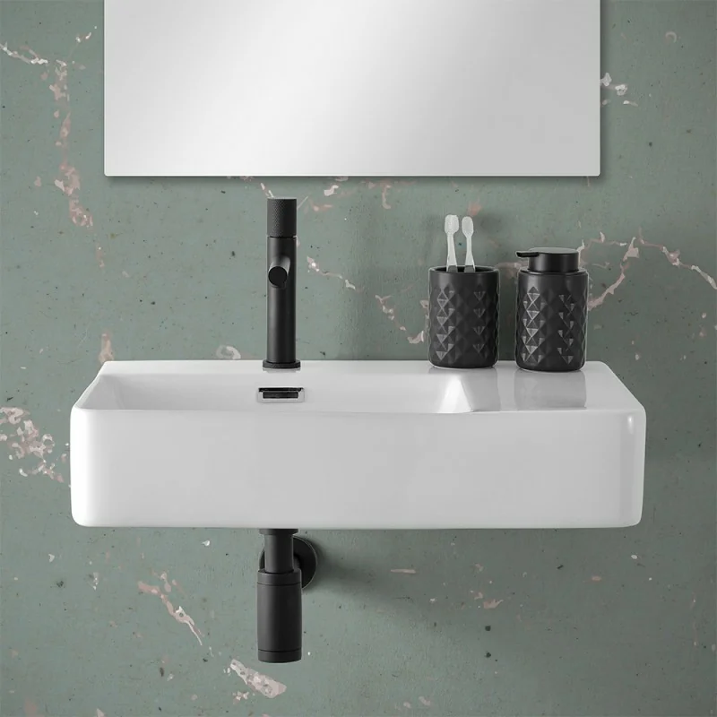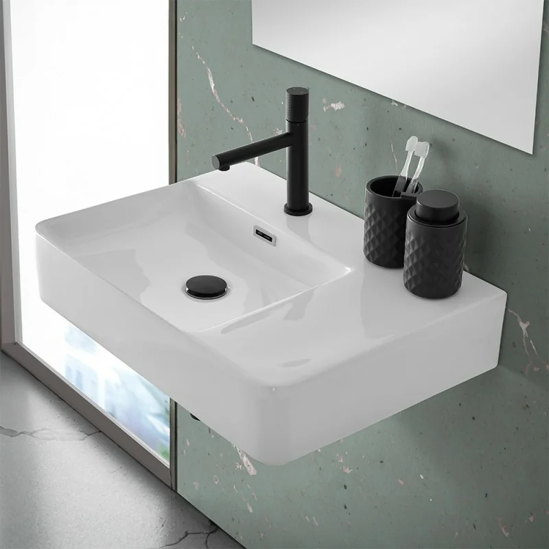 Integralmente realizzato in ceramica con finitura lucida,materiale moderno,performante e facile da pulire,il lavabo sospeso è progettato per soddisfare le esigenze estetiche e funzionali di qualsiasi stanza da bagno. Dispone di foro troppo pieno,foro per miscelatore e fori per installazione sospesa.