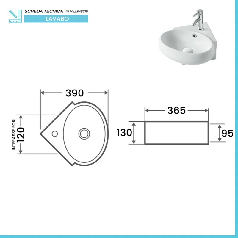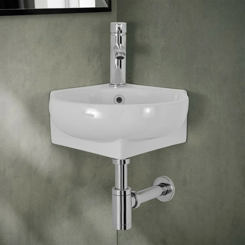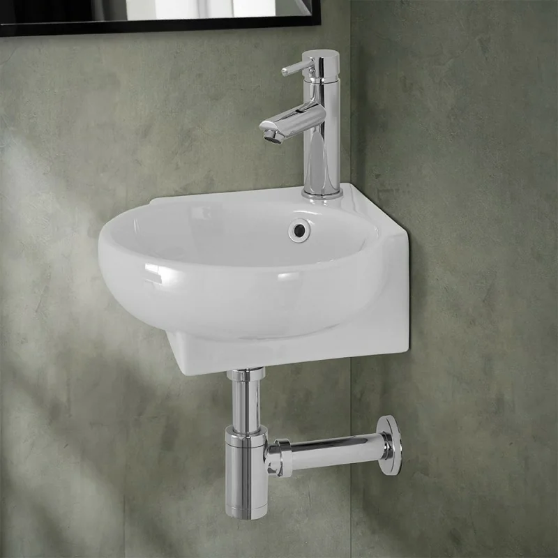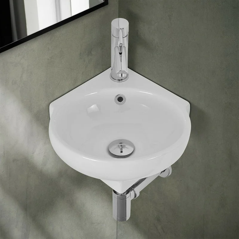 Lavamani piccolo ad angolo con installazione sospesa,troppo pieno e foro miscelatore