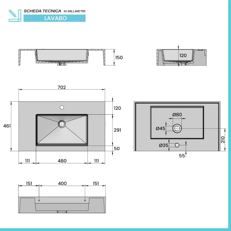 Lavabo sospeso 70 cm in resina bianco lucido caratteristiche tecniche: