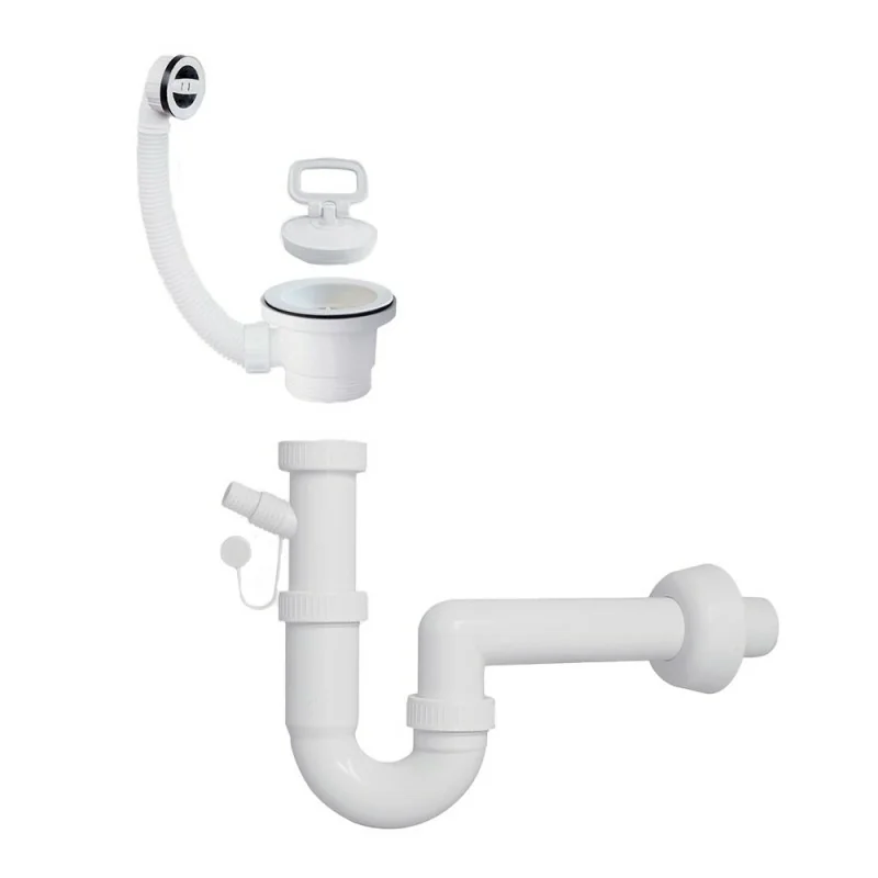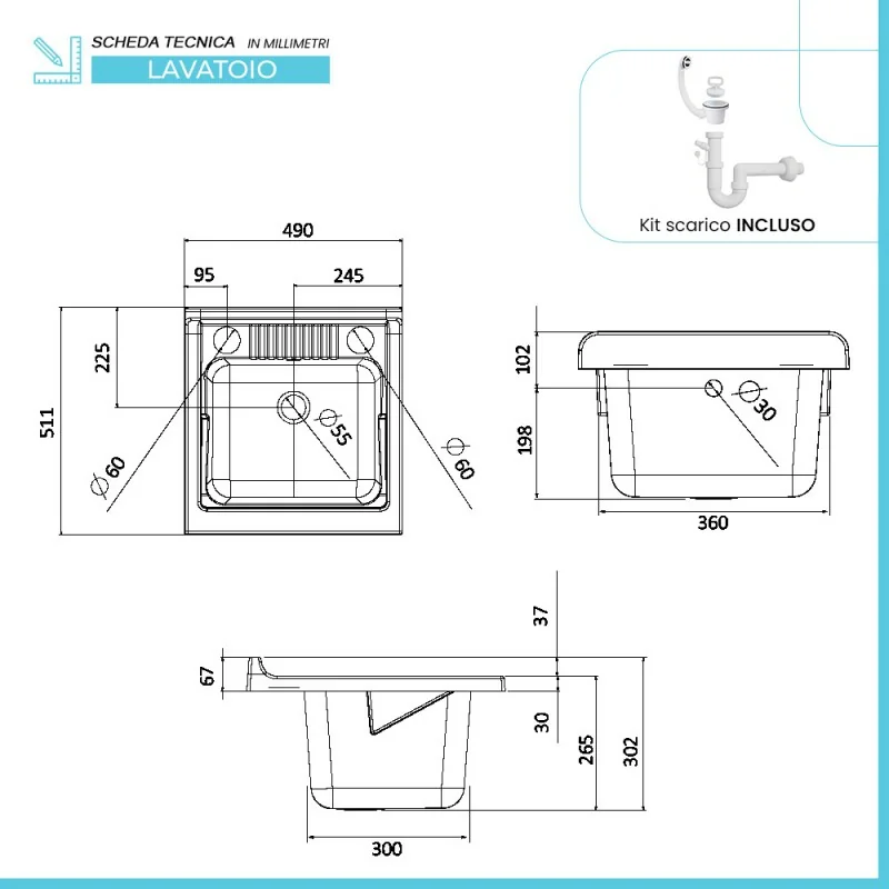 • INCLUDE asse in PVC e kit di scarico con sifone e piletta;