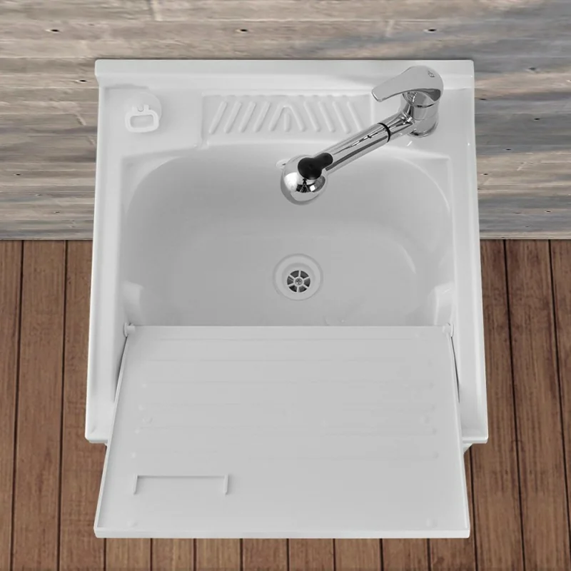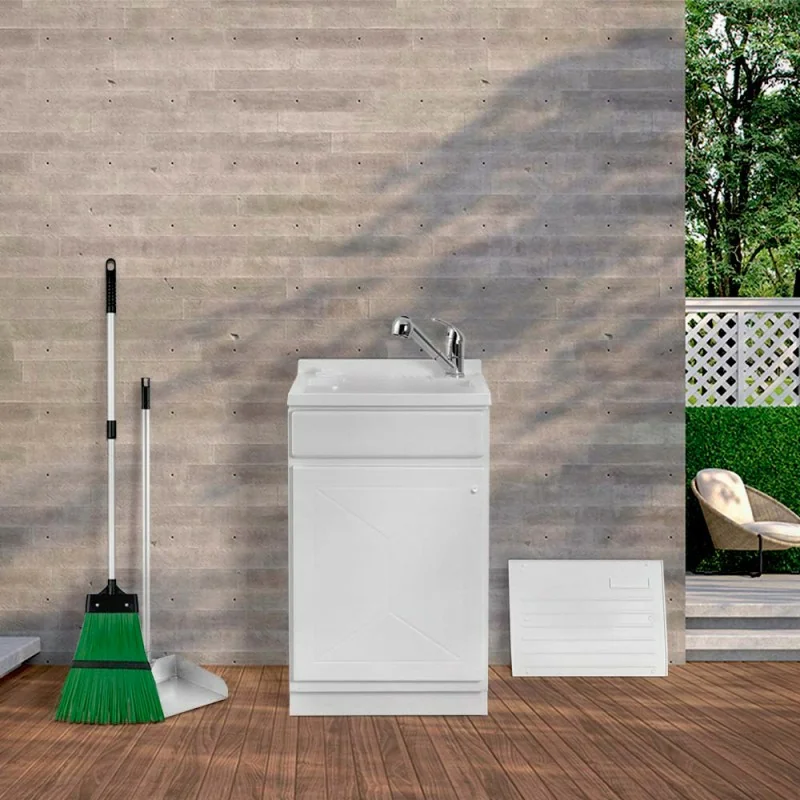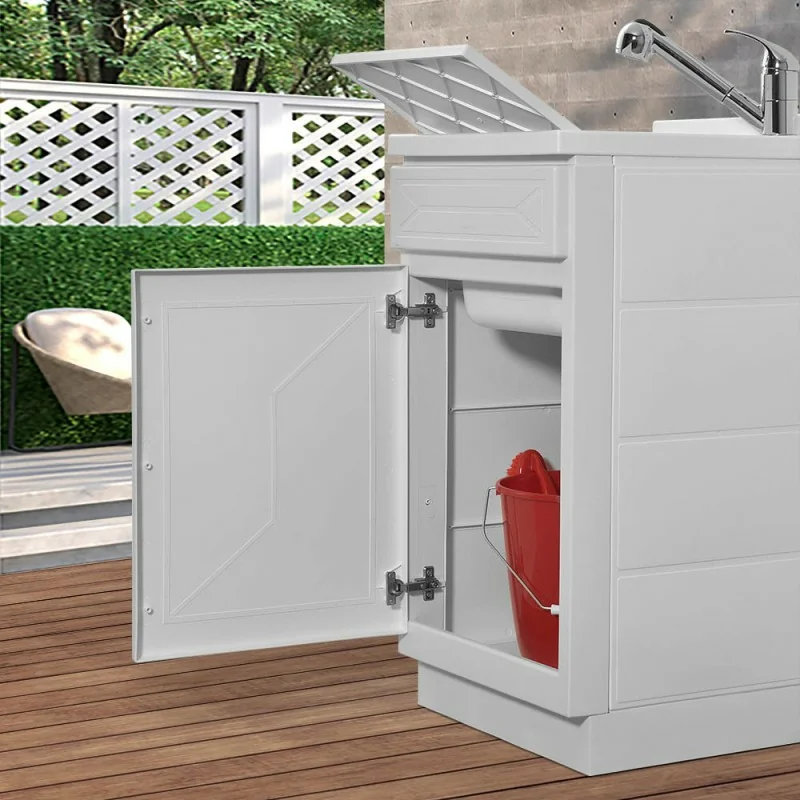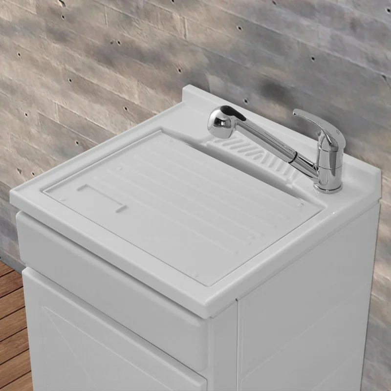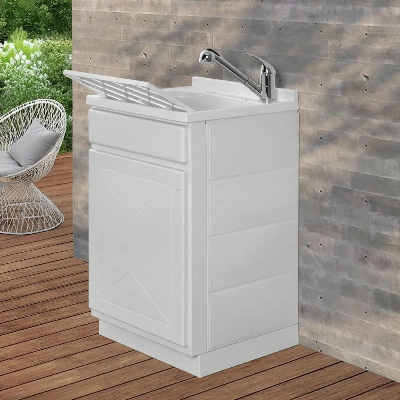 Il mobile lavatoio da esterno è un utilissimo accessorio per la lavanderia. Ha una vasca profonda 25 cm con troppo pieno e ha integrato un pratico piano di lavaggio ribaltabile ed estraibile. All'interno del mobile vi è un ampio spazio dove poter riporre detersivi o altri utensili necessari alla pulizia della casa e del giardino. Il prodotto è realizzato in resina,un materiale altamente resistente: se collocato all'esterno, come terrazzi, balconi, o giardini, la sua tenuta è garantita anche se esposto all'azione di agenti atmosferici. Sul lavatoio è possibile praticare un foro sia a destra che a sinistra per il rubinetto.