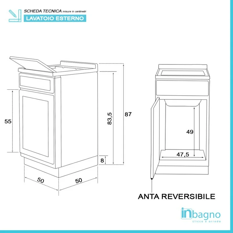 • Tipologia: mobile lavatoio con ampia vasca,1 anta e tavoletta d'appoggio;