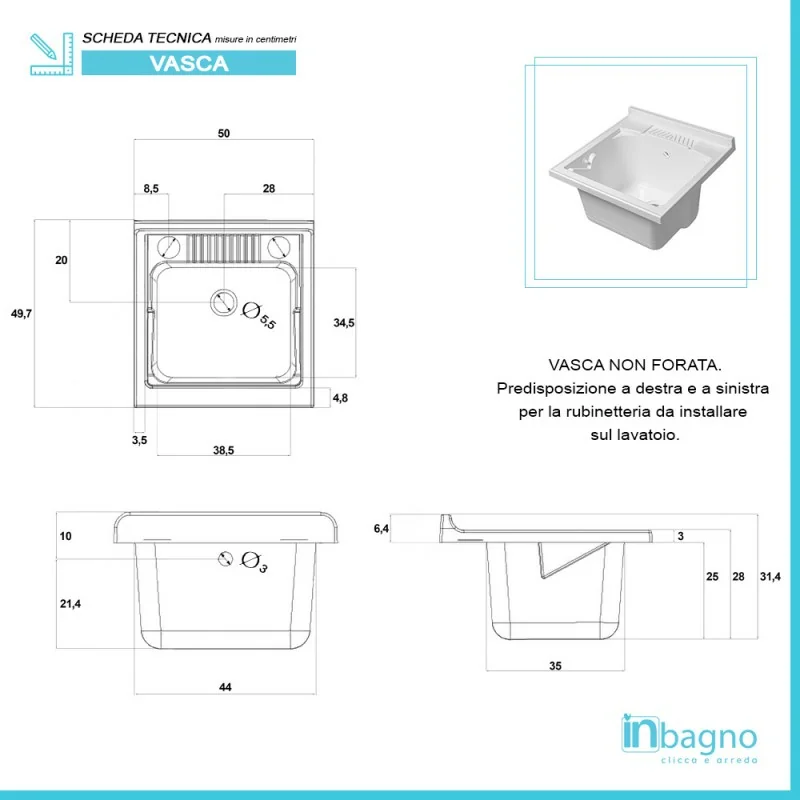 • Dimensioni vasca: L 50 x P 49,7 x H 31,4 cm;