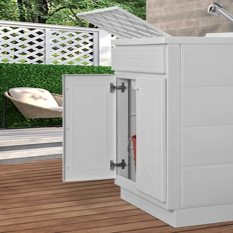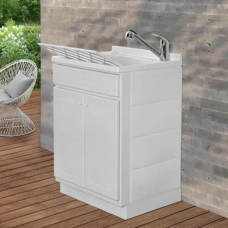 Il mobile lavatoio da esterno è un utilissimo accessorio per la lavanderia. Ha una vasca profonda 28 cm con troppo pieno e ha integrato un pratico piano di lavaggio ribaltabile ed estraibile.