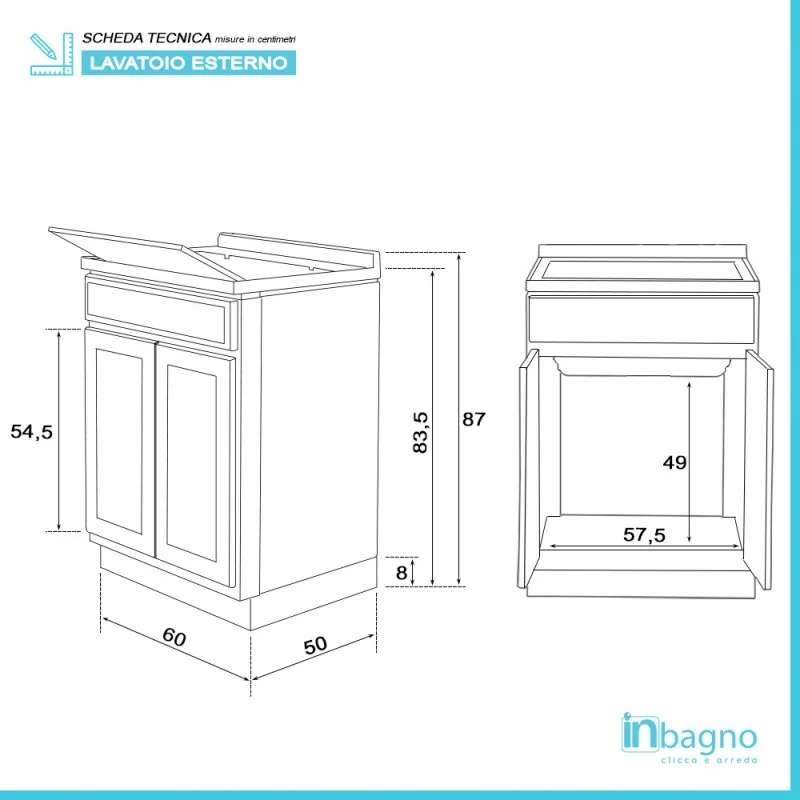 • Tipologia:mobile lavatoio con ampia vasca, 2 ante e tavoletta d'appoggio;