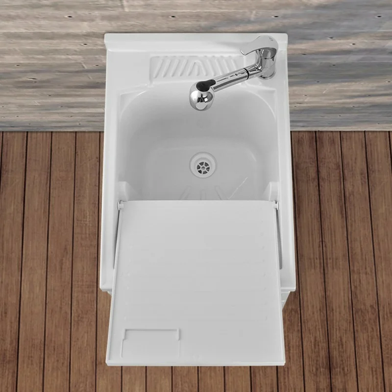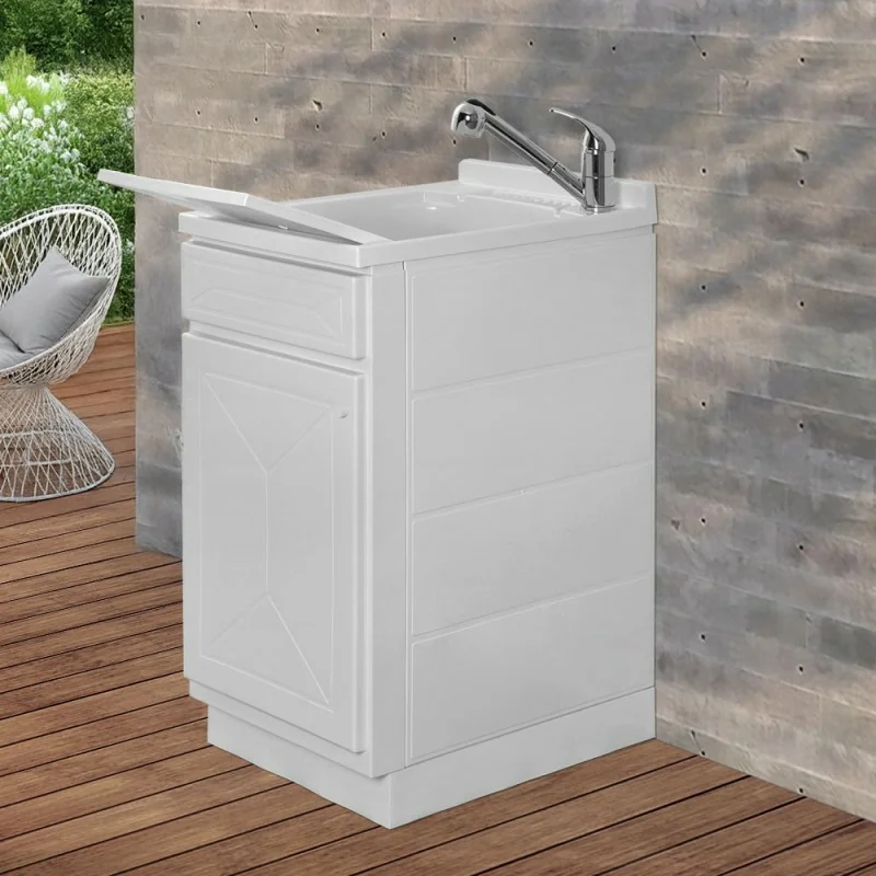 Il mobile lavatoio da esterno è un utilissimo accessorio per la lavanderia. Ha una vasca profonda 26,5 cm con troppo pieno e ha integrato un pratico piano di lavaggio ribaltabile ed estraibile.