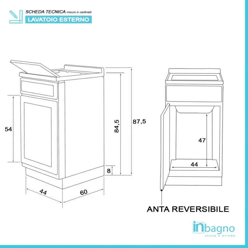 • Tipologia:mobile lavatoio con ampia vasca,1 anta e tavoletta d'appoggio;