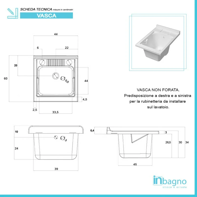• Dimensioni vasca: L 44 x P 60 x H 34 cm