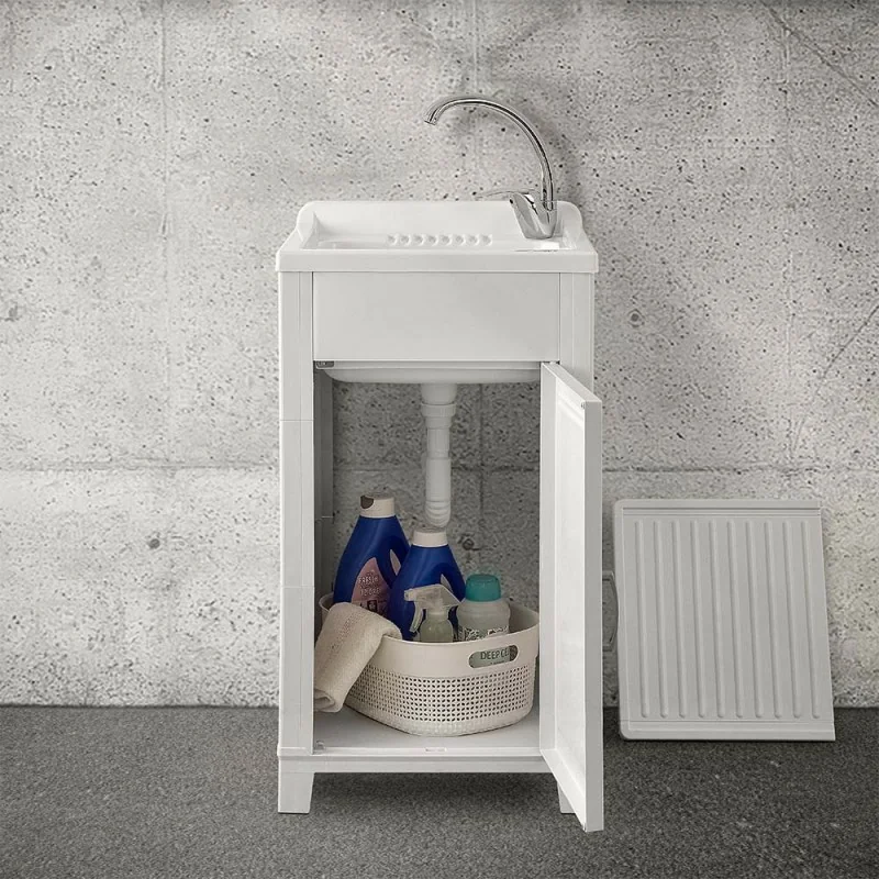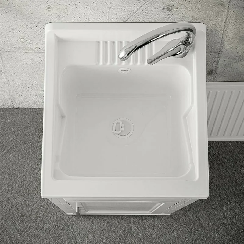 Ha un’anta con un ampio spazio interno largo 36 e profondo 47 cm nel quale poter riporre tutti i prodotti per il bucato. L’ampia vasca in resina è predisposta per il montaggio di un miscelatore monoforo da installare sia sul lato destro che su quello sinistro. Incluso nella confezione ci sarà anche un’asse con strofinatoio ed il kit di scarico con sifone e piletta.