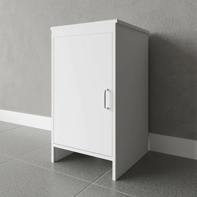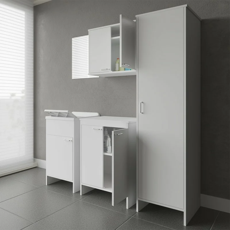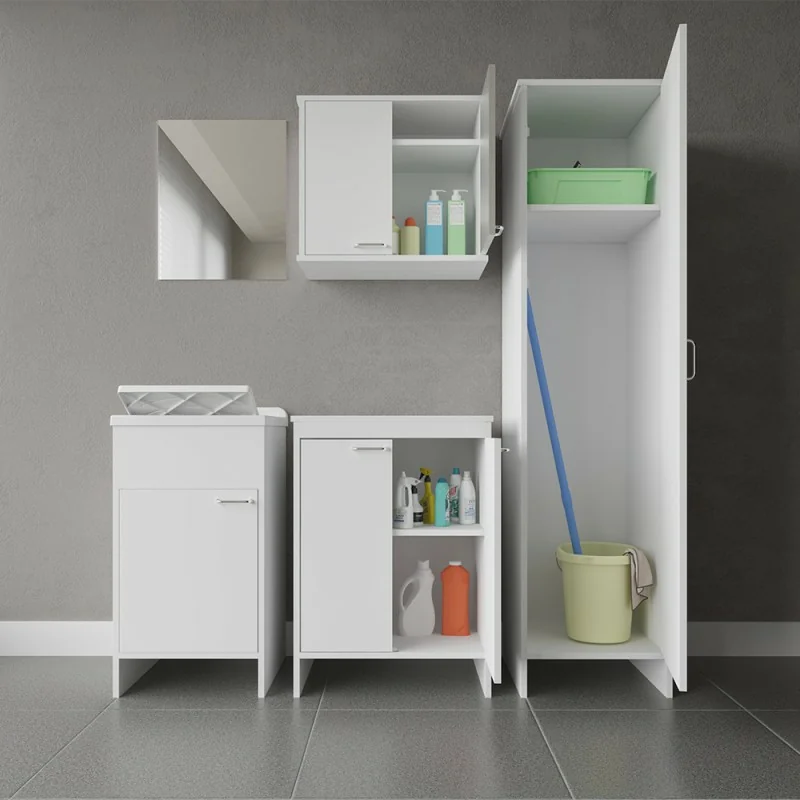 Il mobile multiuso è pratico e comodo,ideato per una maggiore organizzazione degli oggetti lavanderia:dispone di anta a battente con pratica maniglia cromata e ripiano interno. L’installazione in appoggio al pavimento è l’ideale per pareti che non consentono il fissaggio sospeso.