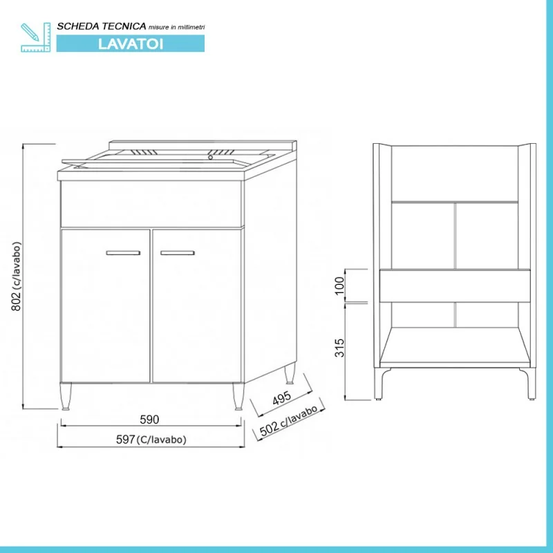Il mobile lavapanni si compone di una pratica vasca lavatoio in resina resistente agli agenti chimici corrosivi presenti nei prodotti di pulizia. Munito di 2 ante con all'interno un abbondante spazio,splendide maniglie in abs cromato e dei piedini sempre in abs cromato.