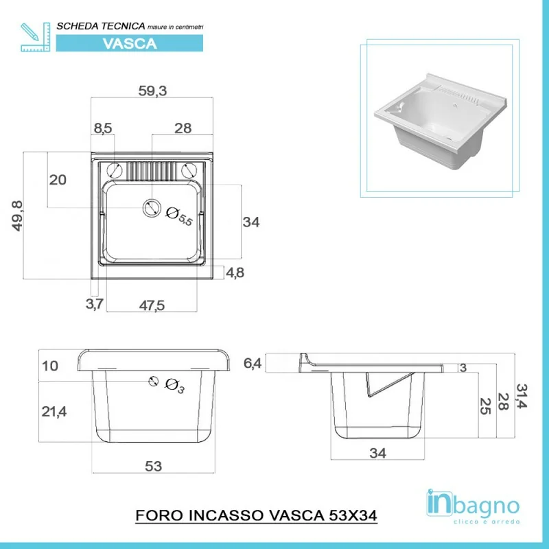 • Dimensioni esterne vasca: L 59,3 x P 49,8 x H 31,4 cm;