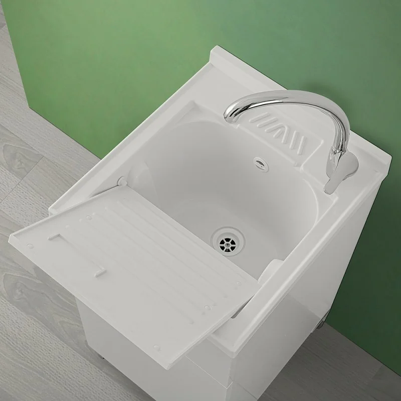 Il lavatoio in resina è completo di asse in pvc e kit scarico con piletta. La vasca viene fornita priva di fori per rubinetteria,in base alle proprie esigenze il miscelatore può essere installato sia nella parte destra che sinistra direttamente sulla vasca.