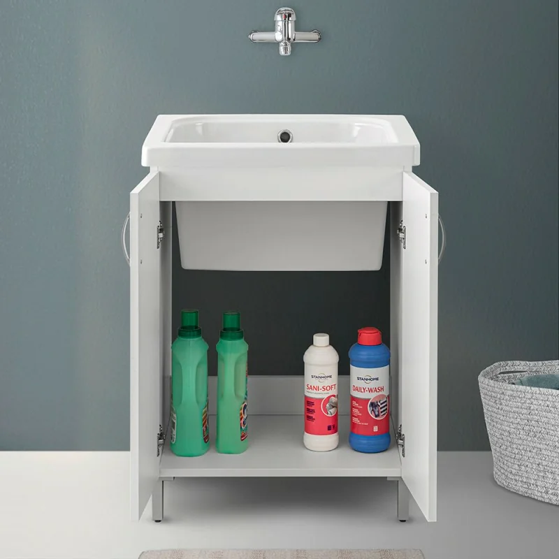 Il mobile lavatoio è il complemento ideale per trarre dalla propria zona lavanderia il massimo delle funzionalità. Realizzato in legno nobilitato con finitura bianco, il mobile lavatoio viene fornito già assemblato, pronto per essere installato in appoggio al pavimento. La composizione include la vasca lavatoio in ceramica bianca lucida, completa di foro per troppo pieno e strofinatoio integrato con predisposizioni per rubinetteria monoforo a destra e a sinistra.