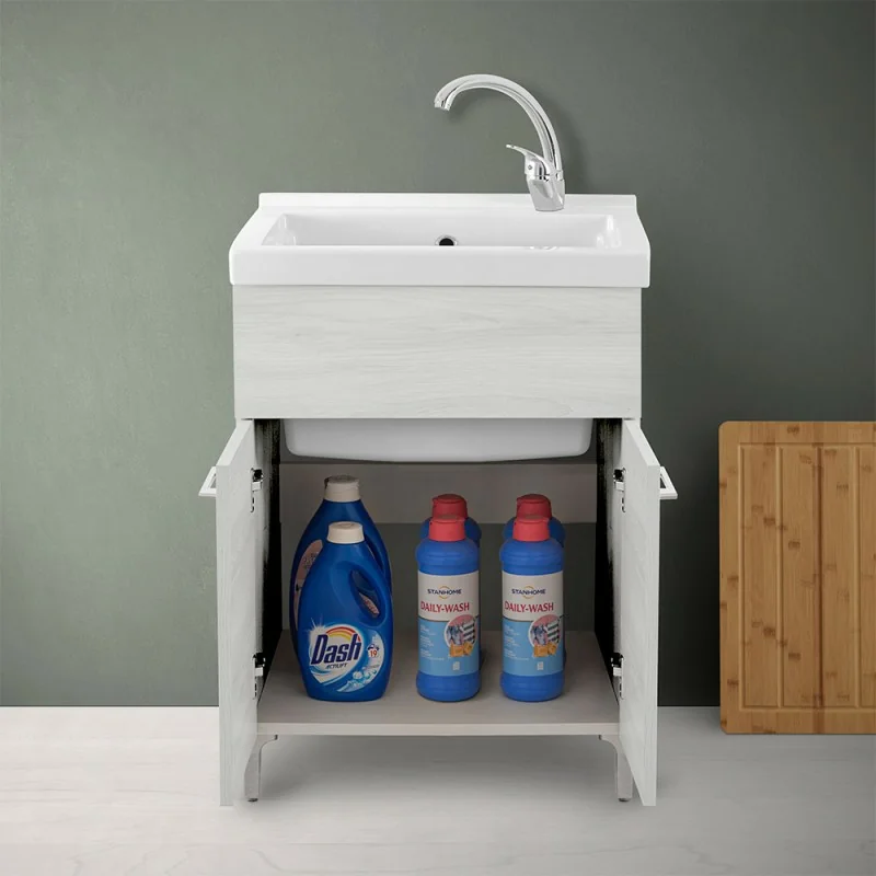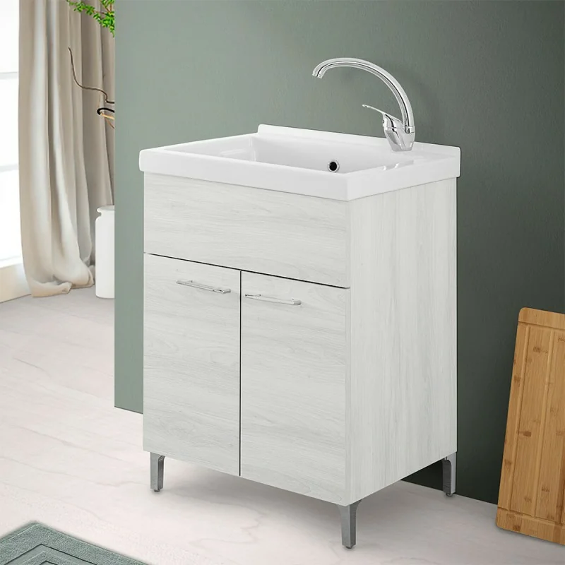 Mobile lavatoio – in rovere bianco con 2 ante,vasca in ceramica e kit di scarico incluso