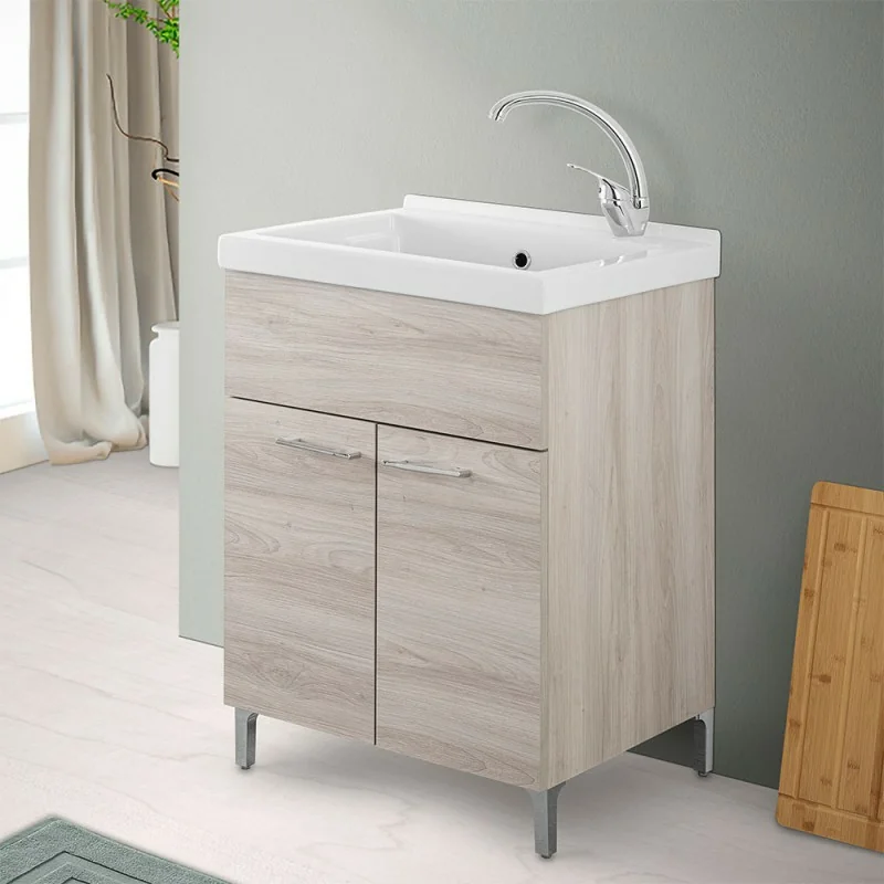 Mobile lavatoio – in rovere grigio con 2 ante,vasca in ceramica e kit di scarico incluso