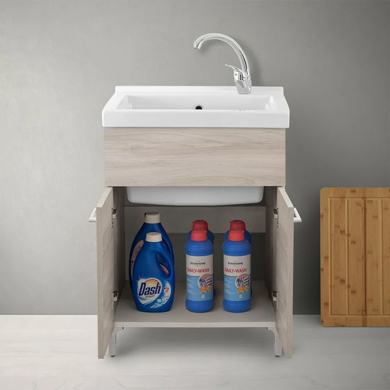 Il mobile lavanderia è realizzato in legno truciolare con finitura in rovere grigio,due ante con ampio vano interno,maniglie e piedini regolabili,per un’ottima installazione anche su piani non perfettamente regolari. Ideale per ambienti interni,il mobile è dotato di una particolare superficie idrorepellente che contrasta eventuali infiltrazioni d’acqua.