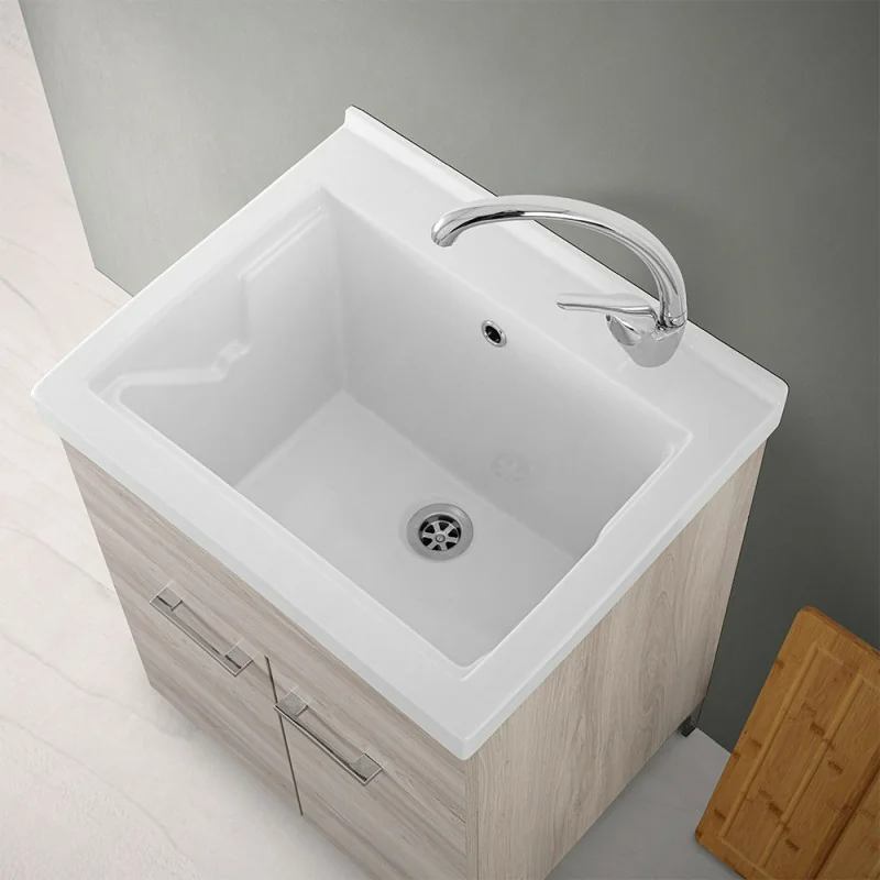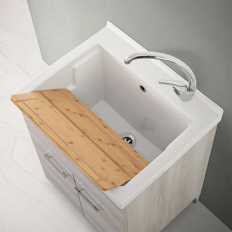 Il mobile ospita una vasca in ceramica di prima qualità,con foro per troppopieno,kit di scarico e predisposizione per la rubinetteria sia a destra che a sinistra. Il lavatoio potrà essere corredato di una comoda asse di lavaggio in legno che si inserisce perfettamente in apposite scanalature della ceramica,per un totale comfort durante il lavaggio della biancheria.