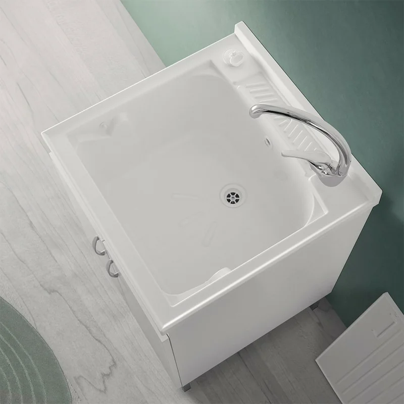 Il mobile ospita una vasca lavapanni in resina priva di fori per miscelatori,a vantaggio di una totale libertà in fase di installazione,sia lato destro che sinistro. Include kit di scarico e comodo asse strofinatoio in PVC che si inserisce perfettamente in apposite scanalature della resina,per un totale comfort durante il lavaggio della biancheria.