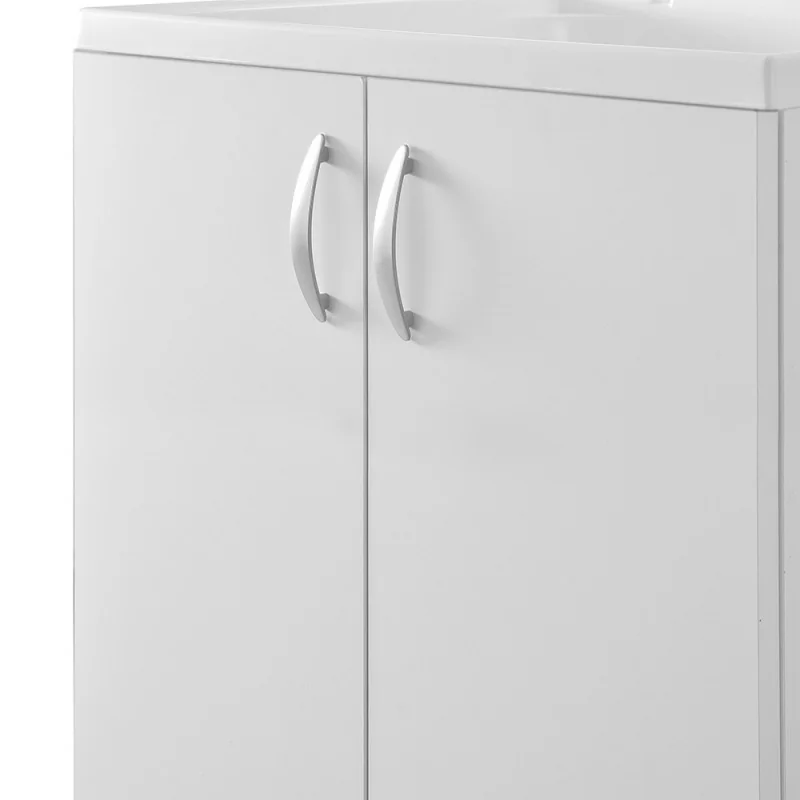 Il mobile lavanderia è realizzato in legno nobilitato con finitura bianca,due ante con ampio vano interno,maniglie e piedini cromati regolabili in altezza,per un’ottima installazione anche su piani non perfettamente regolari;viene spedito già assemblato,pronto per essere installato in appoggio al pavimento.