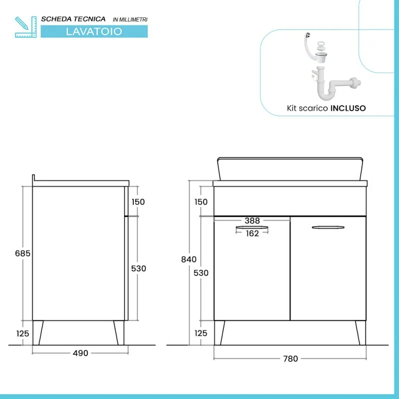 • Mobile già assemblato,INCLUDE kit di scarico con piletta e sifone;