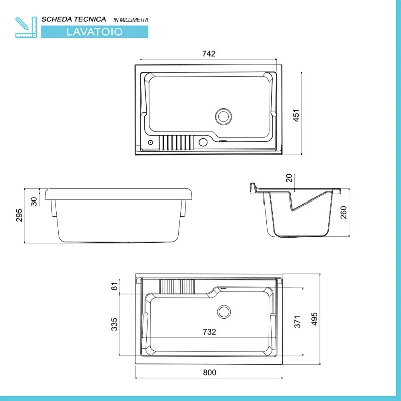 • Dimensioni vasca:L 80 x p 49,5 x H 29,5 cm;