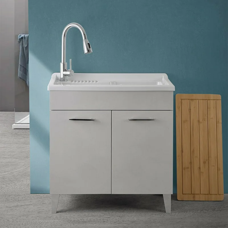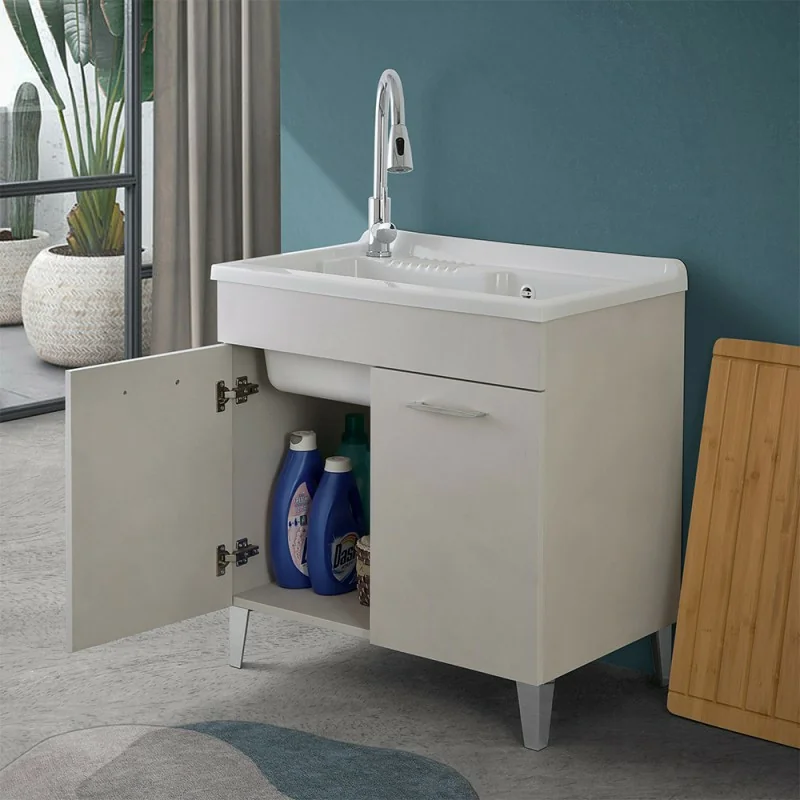 Lavatoio per interno in legno con 2 ante,vasca 80x50 cm in resina con piletta e sifone