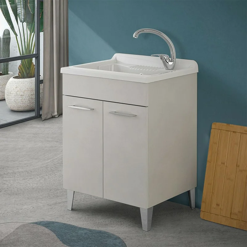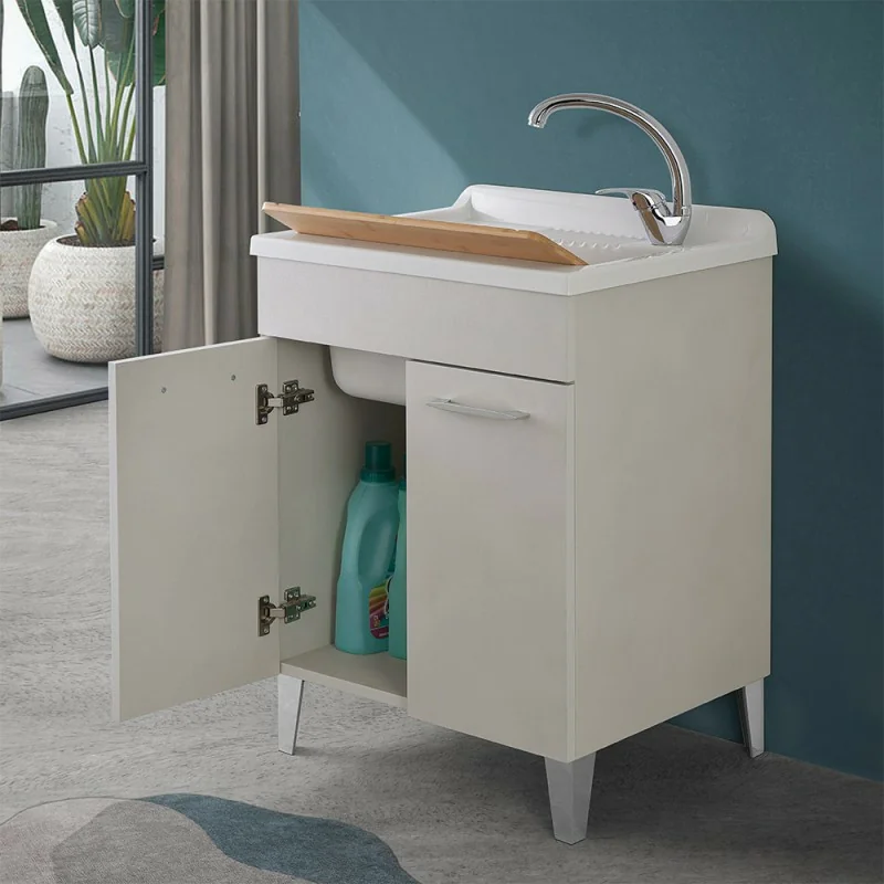 Lavatoio per interno in legno con 2 ante,vasca 60x50 cm in resina con piletta e sifone
