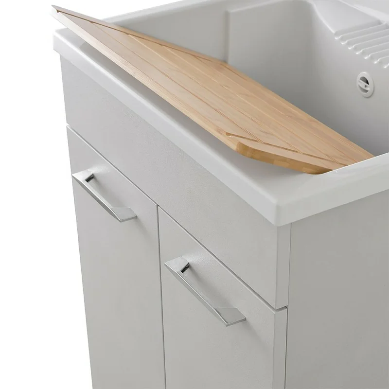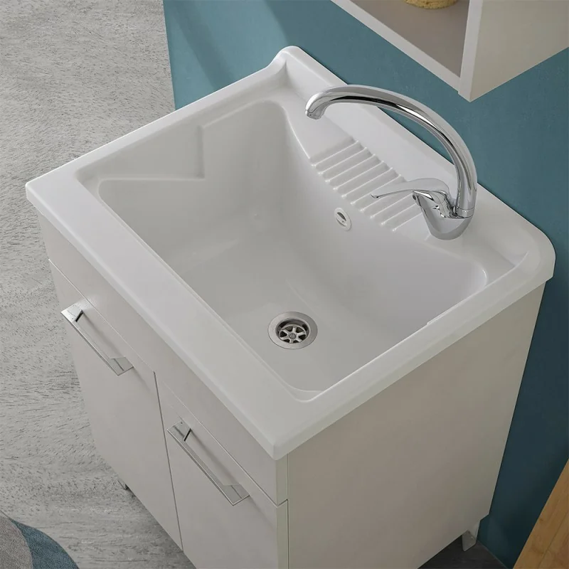 Il mobile lavanderia dispone di due ante con ampio vano interno e apertura tramite maniglie cromate;la base ospita una vasca lavapanni in resina privata di fori per miscelatori con predisposizione sia lato destro che sinistro. Per un arredo lavanderia completo e funzionale,il mobile lavabo include nell'acquisto piletta e sifone di scarico .