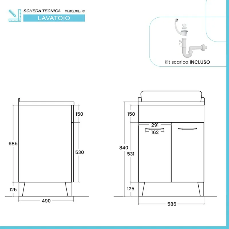 • Mobile già assemblato,INCLUDE kit di scarico con piletta e sifone;