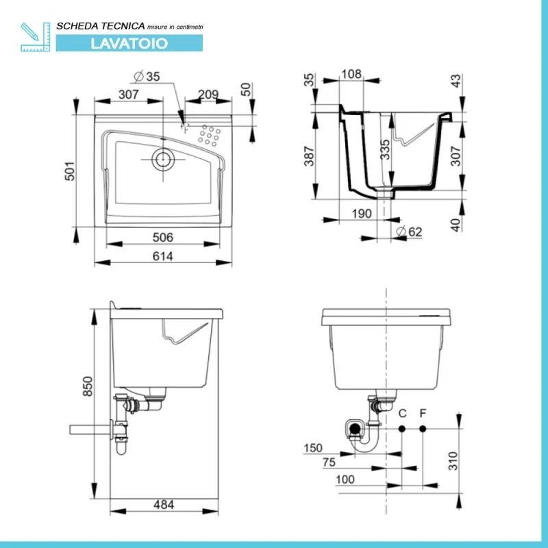 • Dimensioni vasca:L 61,4 x p 50,1 x H 38,7 cm;