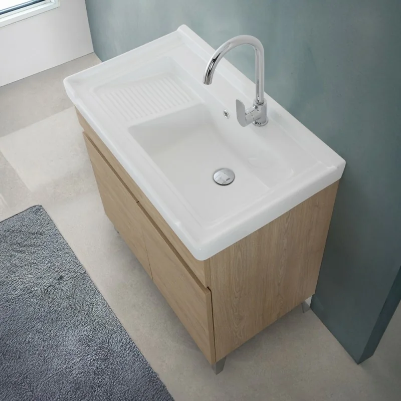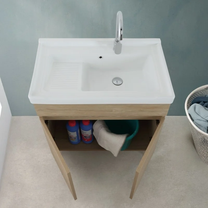 Mobile lavanderia rovere dolomite con vasca in ceramica dotata di zona strofinatoio e kit di scarico