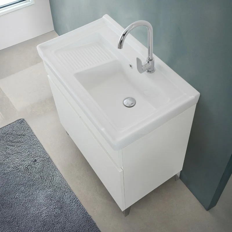 Mobile lavanderia bianco frassinato con vasca in ceramica dotata di zona strofinatoio e kit di scarico