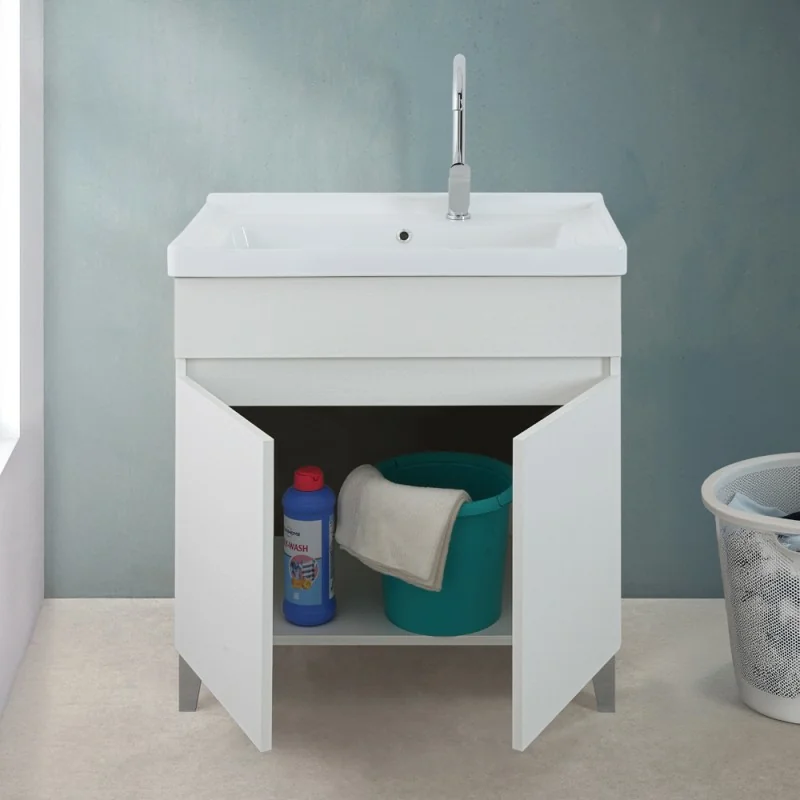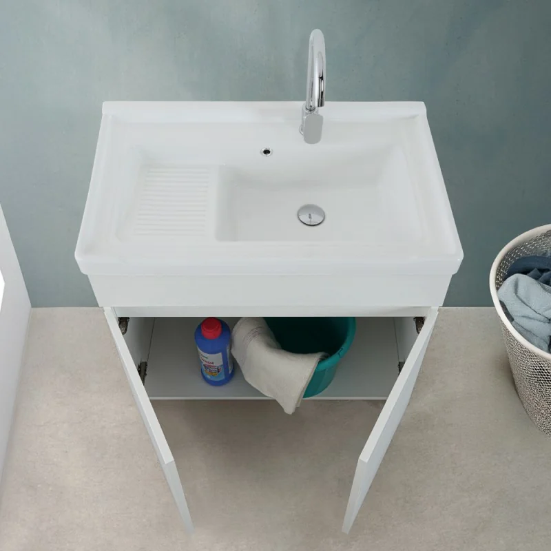 Progettato in legno nobilitato con due ante apribili a gola, il mobile lavanderia ospita il lavatoio realizzato in ceramica di qualità con apposita zona strofinatoio, foro per troppo pieno e pratica predisposizione per foro rubinetteria. Completo di kit di scarico è pronto all’uso.