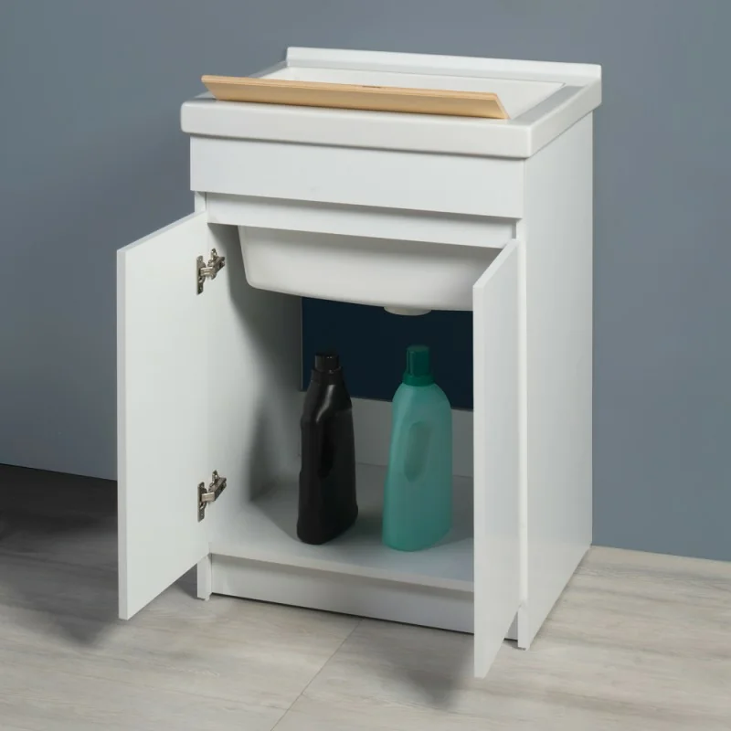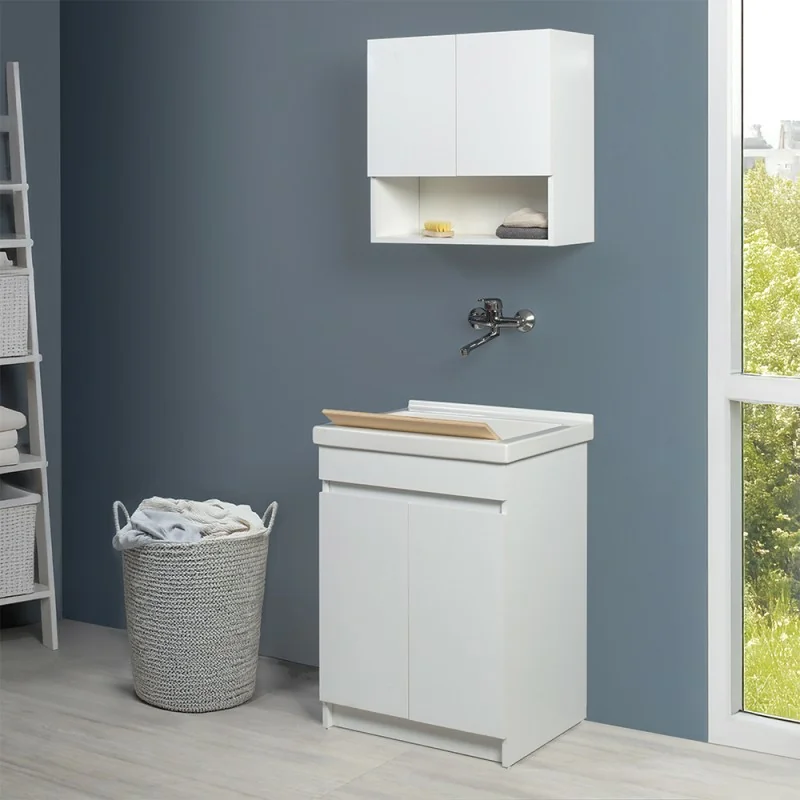 Progettato in legno nobilitato con due ante apribili a gola, il mobile lavanderia ospita il lavatoio realizzato in ceramica di qualità, foro per troppo pieno e pratica predisposizione per foro rubinetteria. Completo di kit di scarico è pronto all’uso.
