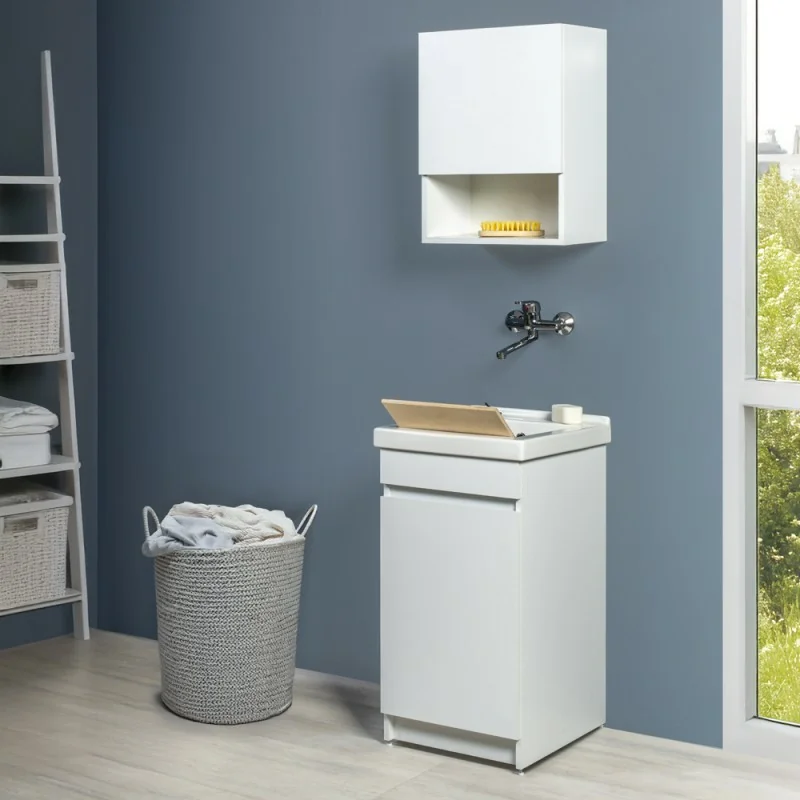 Mobile lavanderia bianco opaco con vasca in ceramica e kit di scarico