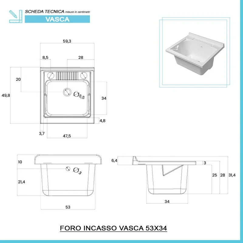• Dimensioni vasca: L 59,3 x p 49,8 x H 31,4 cm;