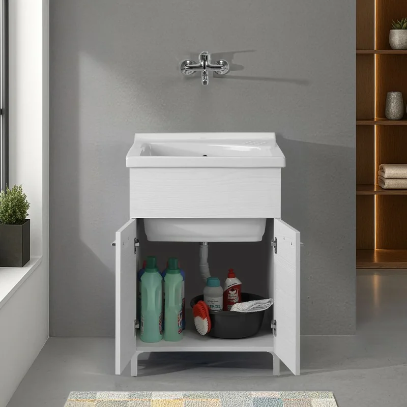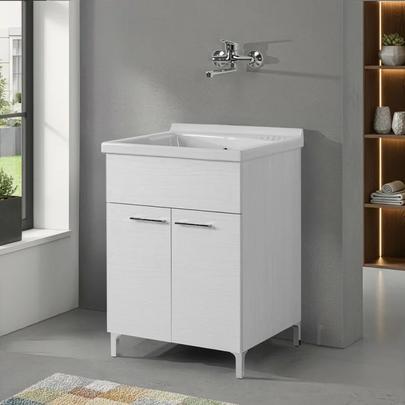 Mobile lavatoio 60x60cm bianco frassino con due ante e vasca in ceramica Revine