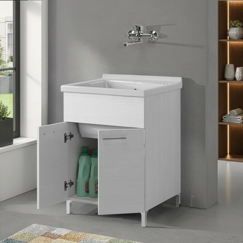 Il mobile lavanderia 60x60 cm Linea Revine con lavatoio in ceramica Dolomite unisce stile e praticità. Con due ante, piedini e una vasca Made in Italy resistente e facile da pulire, è la soluzione ideale per una lavanderia ordinata e funzionale.