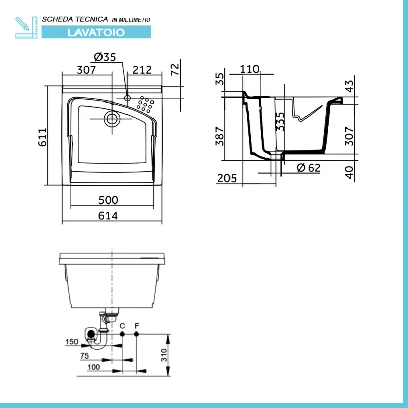 • Dimensioni vasca: L 61,4 x p 61,1 x H 30,7 cm;